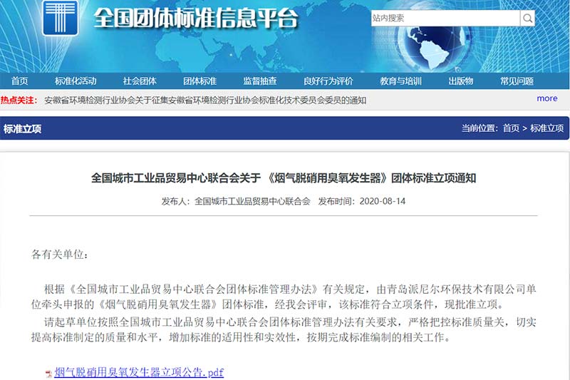 • 全國城市工業品貿易中心聯合會關于《煙氣脫硝用臭氧發生器》團體標準立項通知